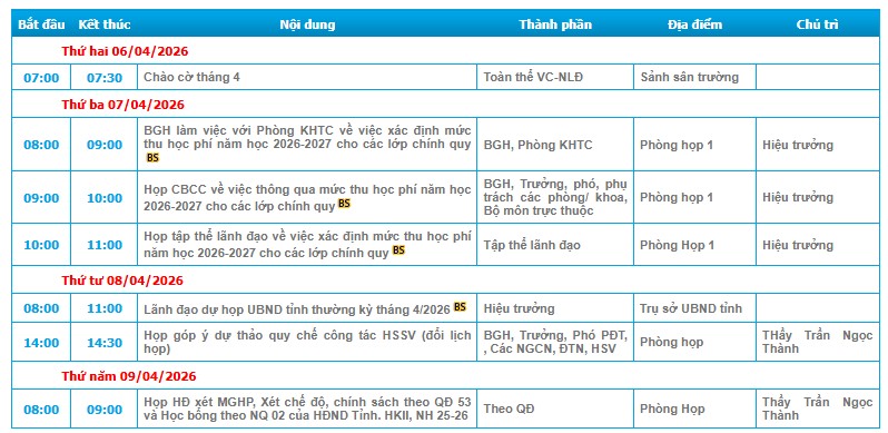 LỊCH CÔNG TÁC TUẦN 15 (Từ ngày 06/4 đến ngày 12/4/2026)