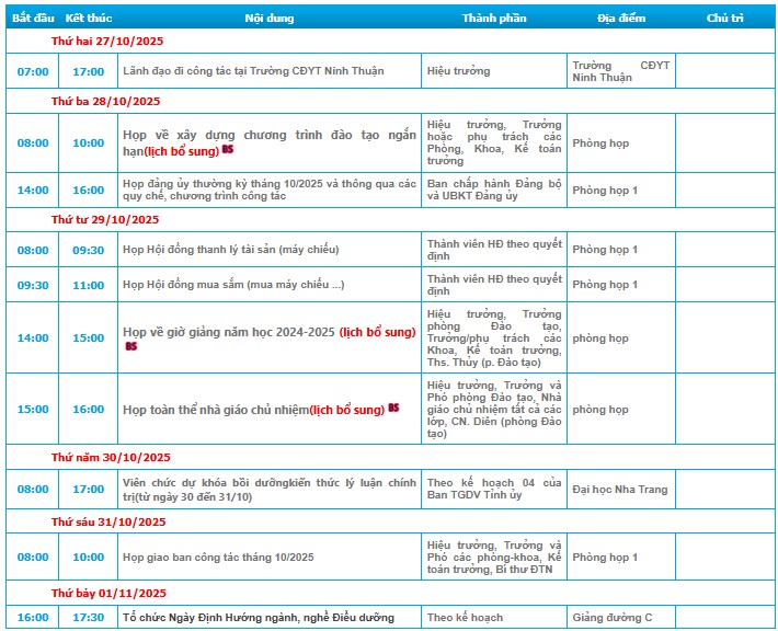 LỊCH CÔNG TÁC TUẦN 44 (Từ ngày 27/10 đến ngày 02/11/2025)